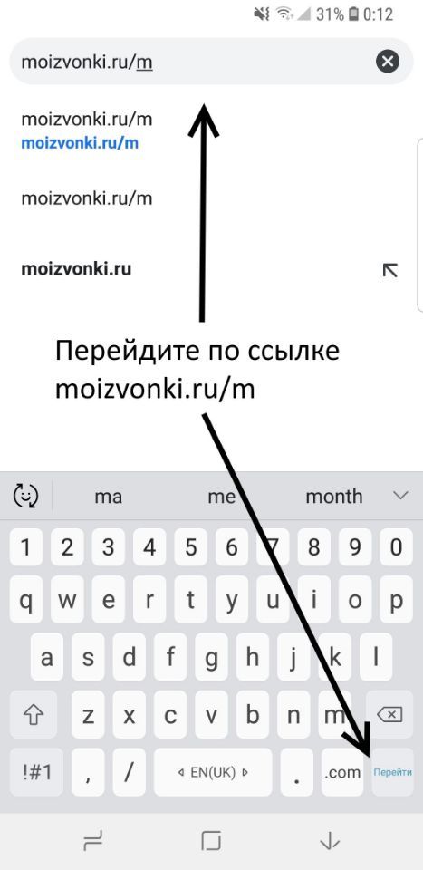 В телефоне открыть браузер и перейти по адресу moizvonki.ru/m (или отправить ссылку moizvonki.ru/m в WhatsApp, почту и т.п. и открыть оттуда